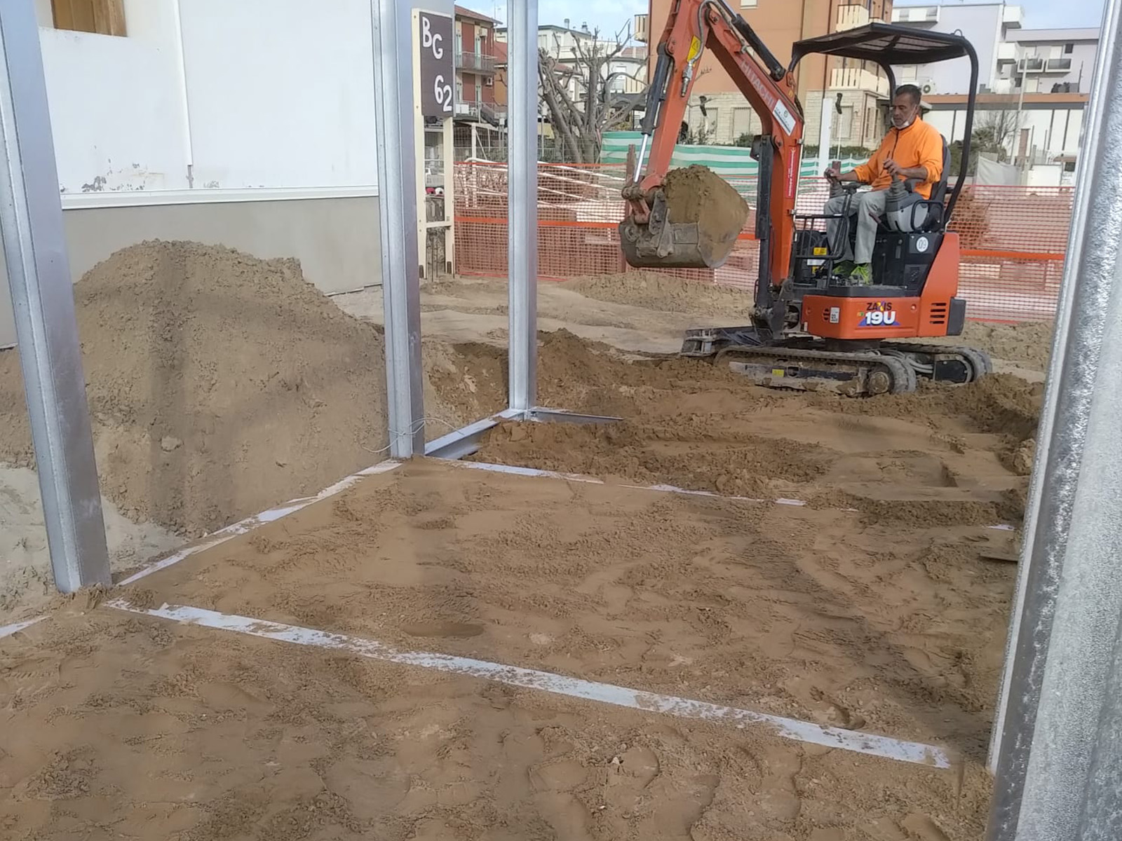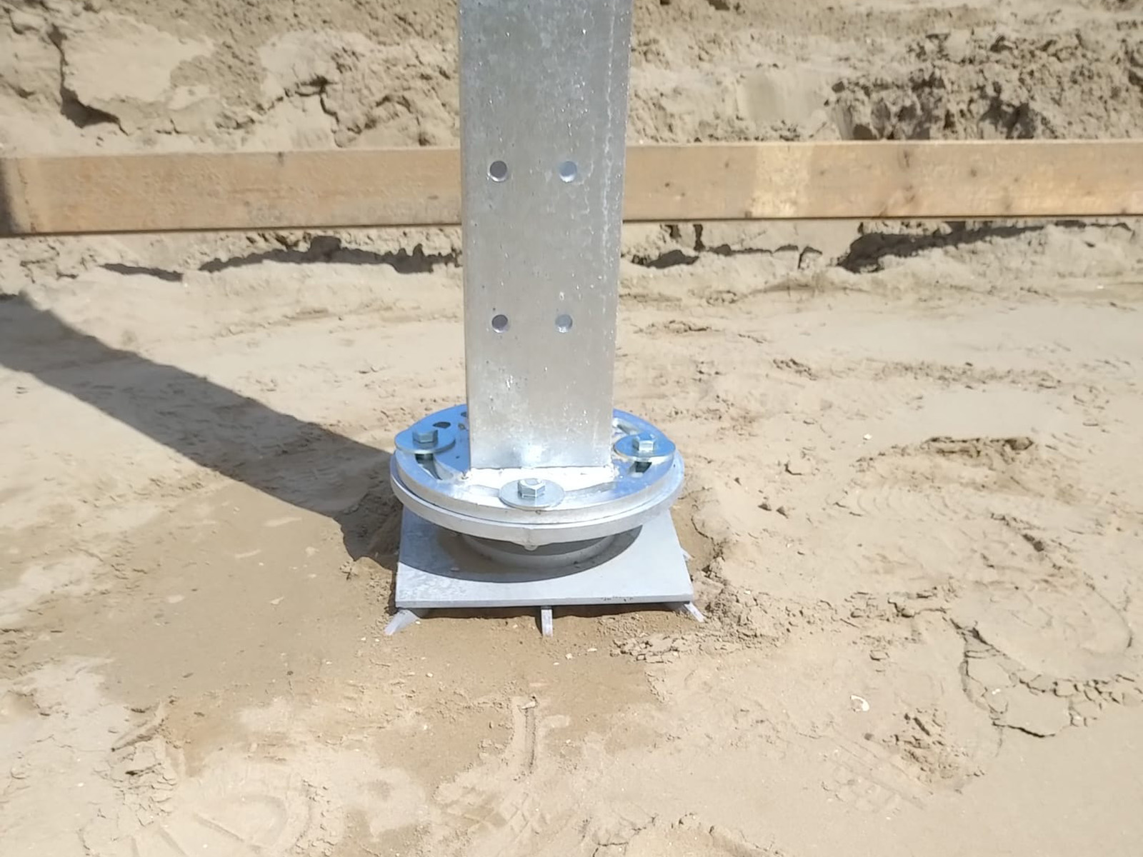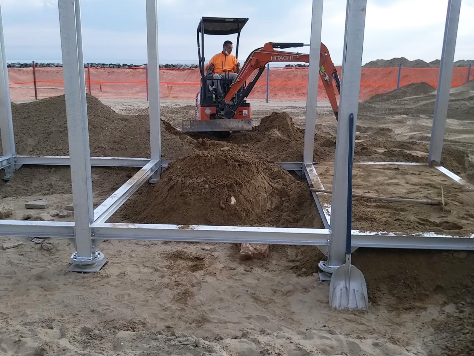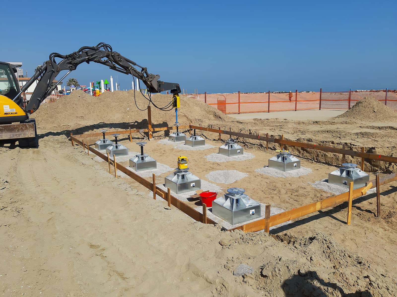Uno sguardo ravvicinato sui plinti per pali Geosmart durante l’installazione sul litorale di Rimini. Tecnologia e precisione si fondono per rispettare l’ambiente.