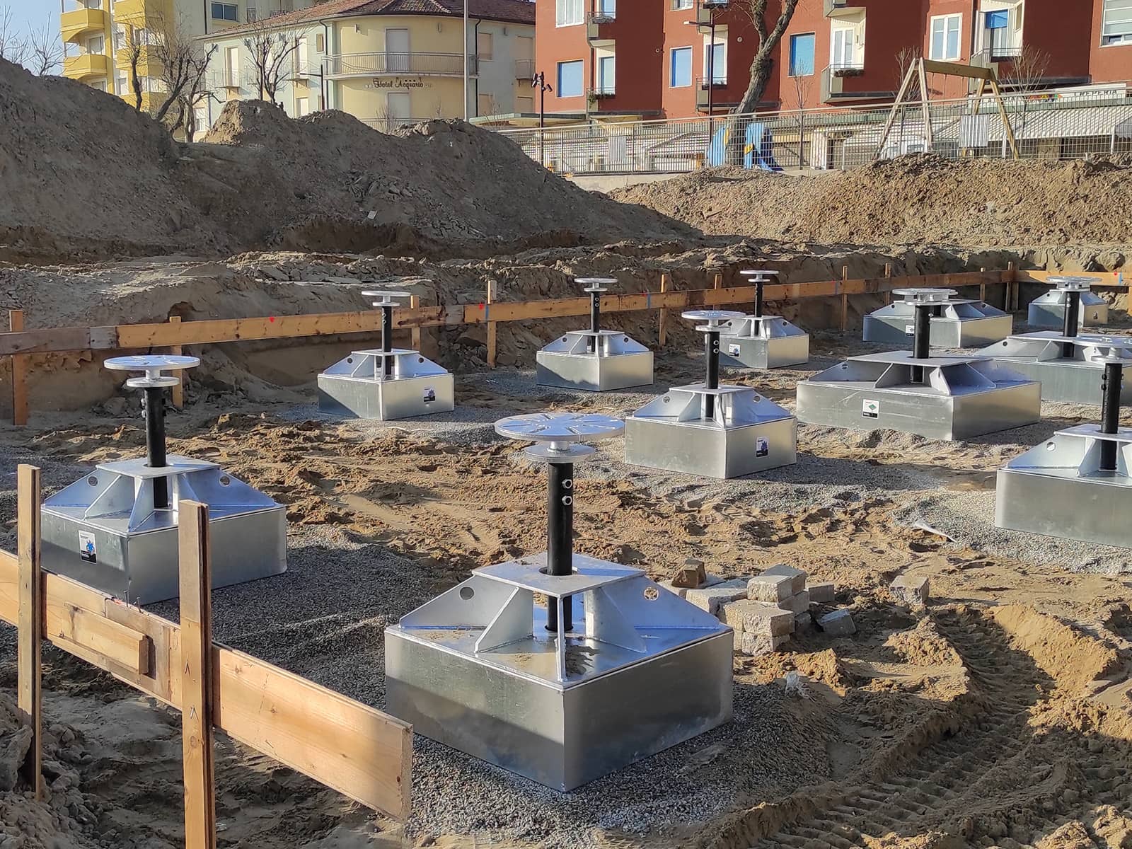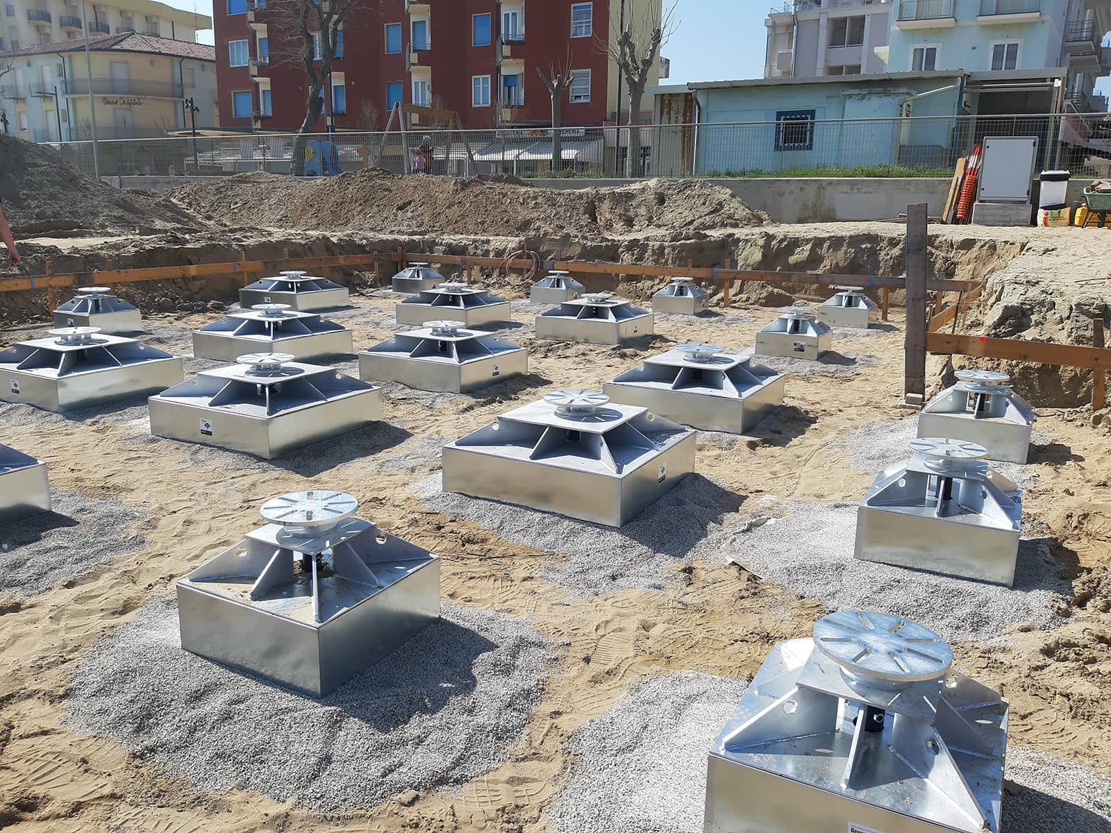 Dopo aver superato accurati controlli tecnici e ottenuto le necessarie autorizzazioni, il progetto ha visto la fornitura di 38 plinti di fondazione di due diversi modelli, GSM-2 e GSM-3, selezionati in base ai carichi strutturali previsti per due edifici distinti.