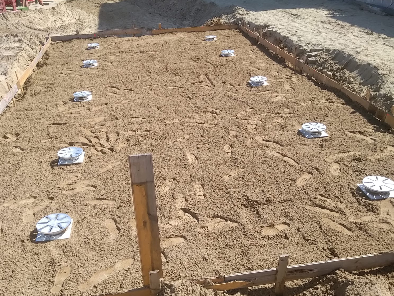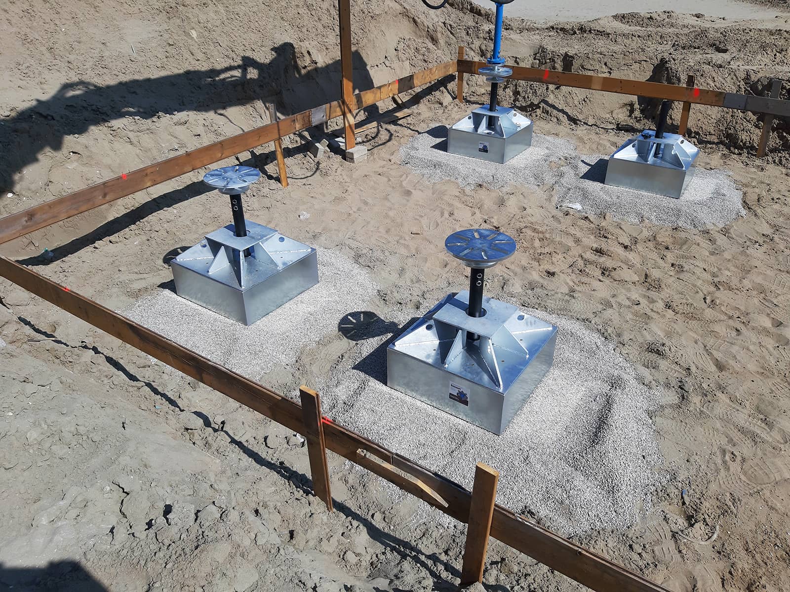 L’uso di uno strato di pietrisco sotto ogni plinto di fondazione ha ulteriormente garantito l’uniformità e la stabilità del piano d’appoggio.